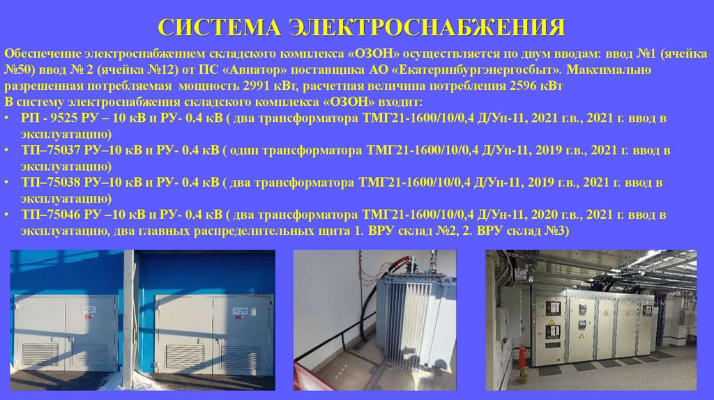 СИСТЕМА ЭЛЕКТРОСНАБЖЕНИЯОбеспечение электроснабжением складского комплекса «ОЗОН» осуществляется по двум вводам: ввод №1 (ячейка