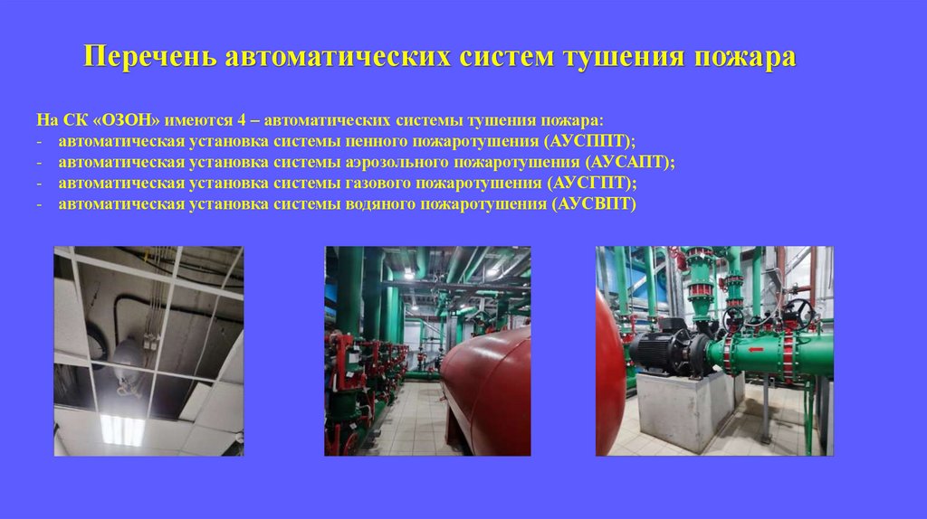 Перечень автоматических систем тушения пожараНа СК «ОЗОН» имеются 4 – автоматических системы тушения пожара: