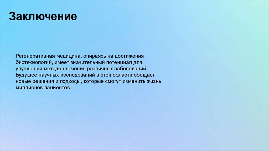 ЗаключениеРегенеративная медицина, опираясь на достижения