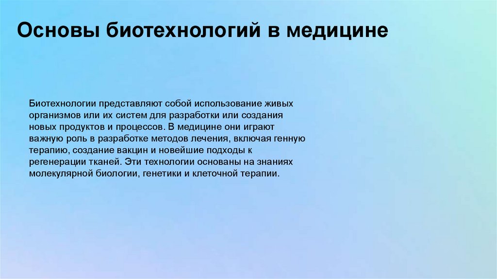 Основы биотехнологий в медицинеБиотехнологии представляют собой использование живых