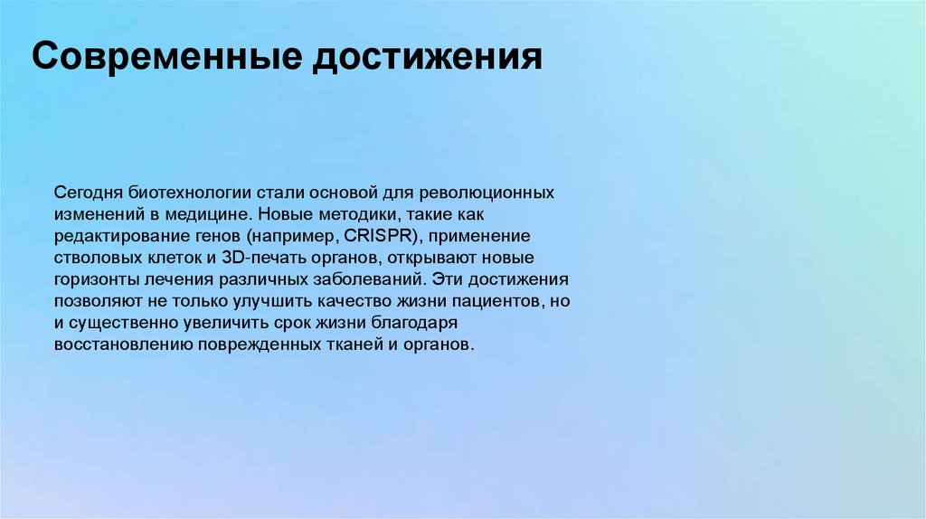 Современные достиженияСегодня биотехнологии стали основой для революционных