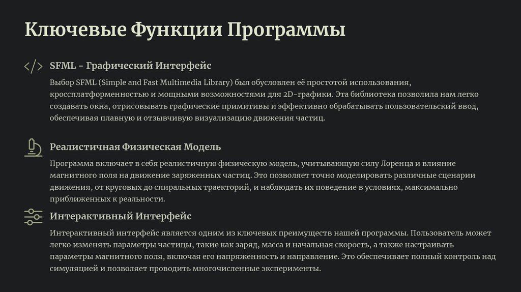 Программа включает в себя реалистичную физическую модель, учитывающую силу Лоренца и влияние