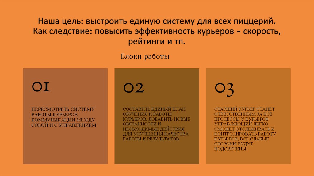 Проект по настройке системы работы курьеров.2. Наша цель: выстроить единую систему для всех пиццерий. Как следствие: повысить эффективность курьеров - скорость, рейтинги и