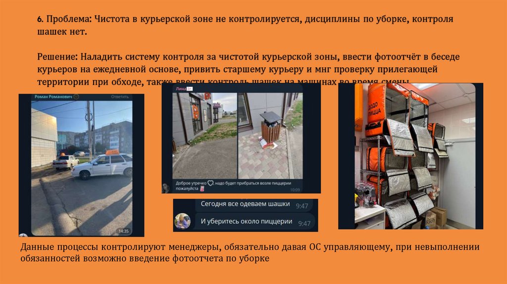 6. Проблема: Чистота в курьерской зоне не контролируется, дисциплины по уборке, контроляшашек нет.