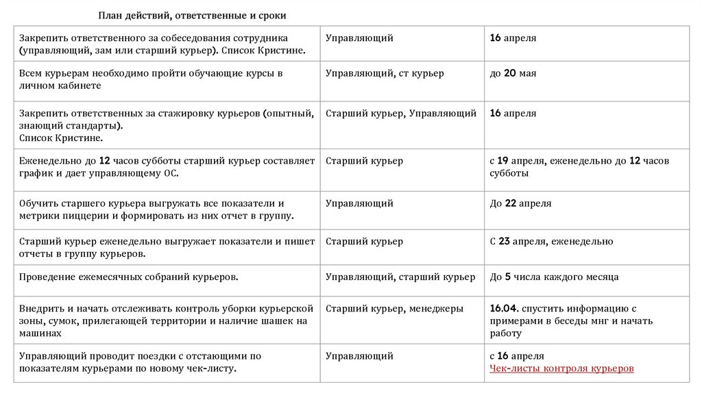 План действий, ответственные и срокиЗакрепить ответственного за собеседования сотрудника