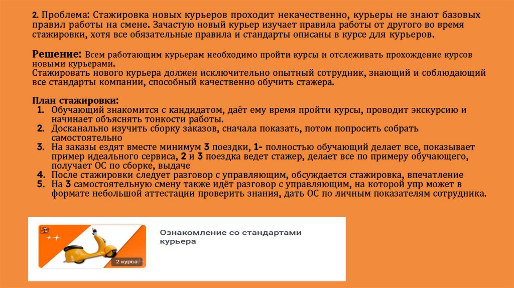2. Проблема: Стажировка новых курьеров проходит некачественно, курьеры не знают базовыхправил работы на смене. Зачастую новый курьер изучает правила работы от другого во время