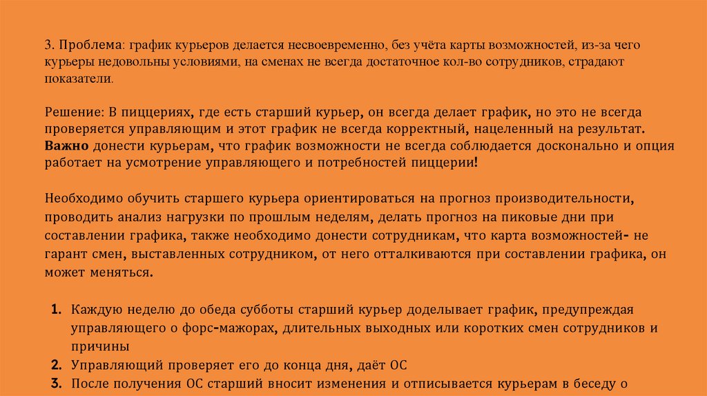 3. Проблема: график курьеров делается несвоевременно, без учёта карты возможностей, из-за чегокурьеры недовольны условиями, на сменах не всегда достаточное кол-во сотрудников, страдают