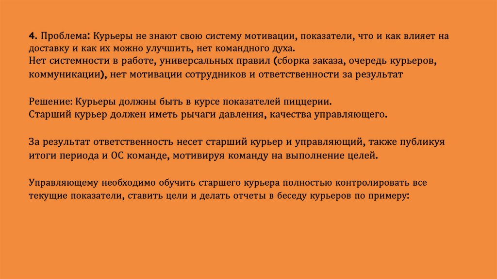 4. Проблема: Курьеры не знают свою систему мотивации, показатели, что и как влияет надоставку и как их можно улучшить, нет командного духа.