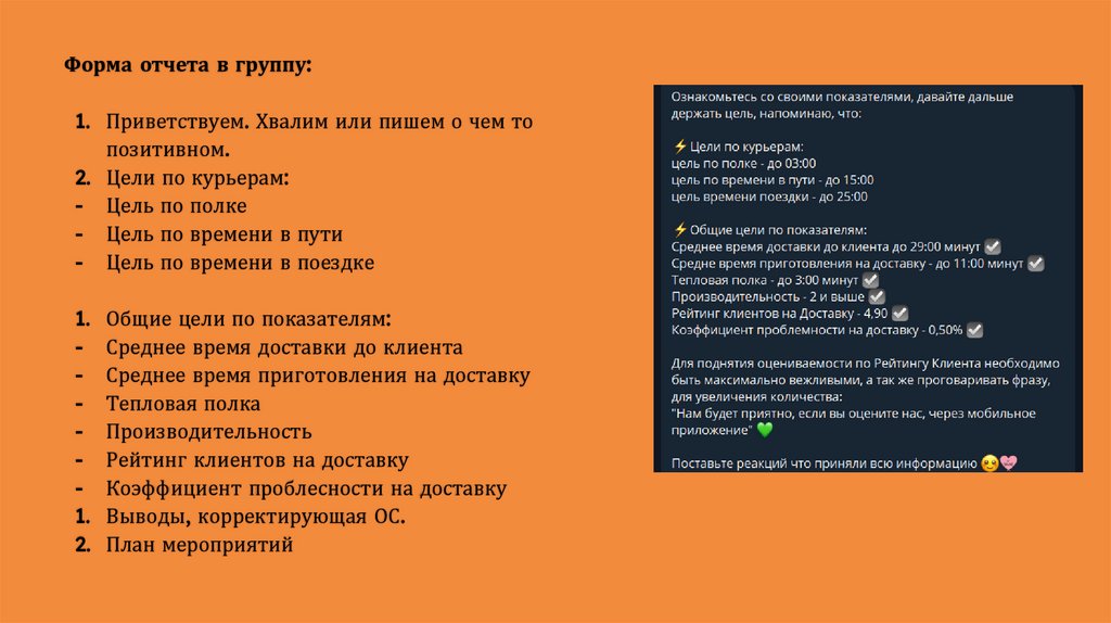 текущие показатели, ставить цели и делать отчеты в беседу курьеров по примеру: