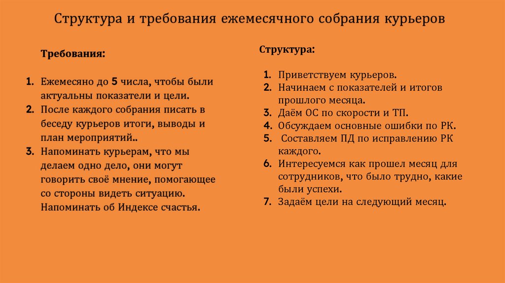 9. Структура и требования ежемесячного собрания курьеров