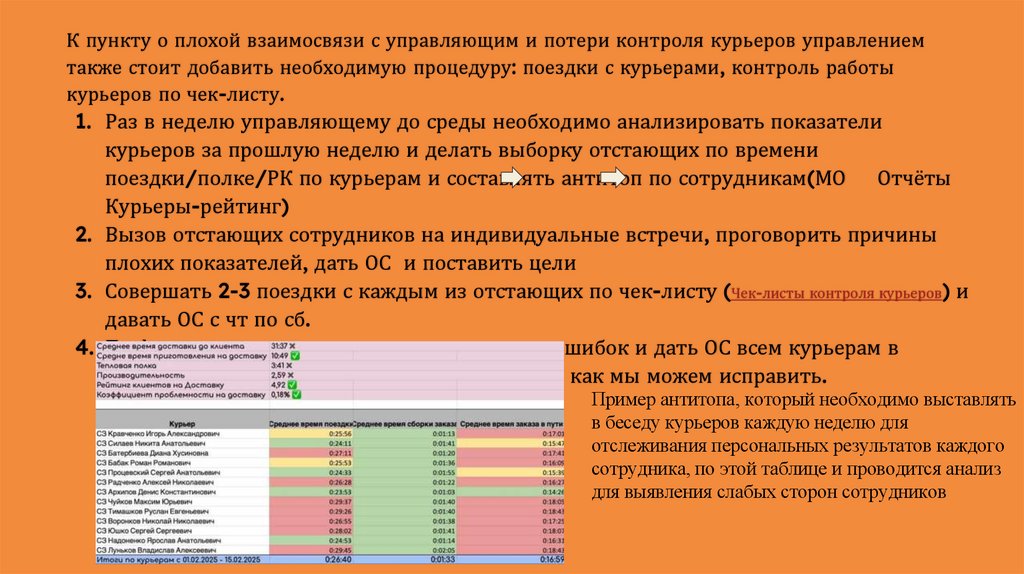 3. Совершать 2-3 поездки с каждым из отстающих по чек-листу (Чек-листы контроля курьеров) и