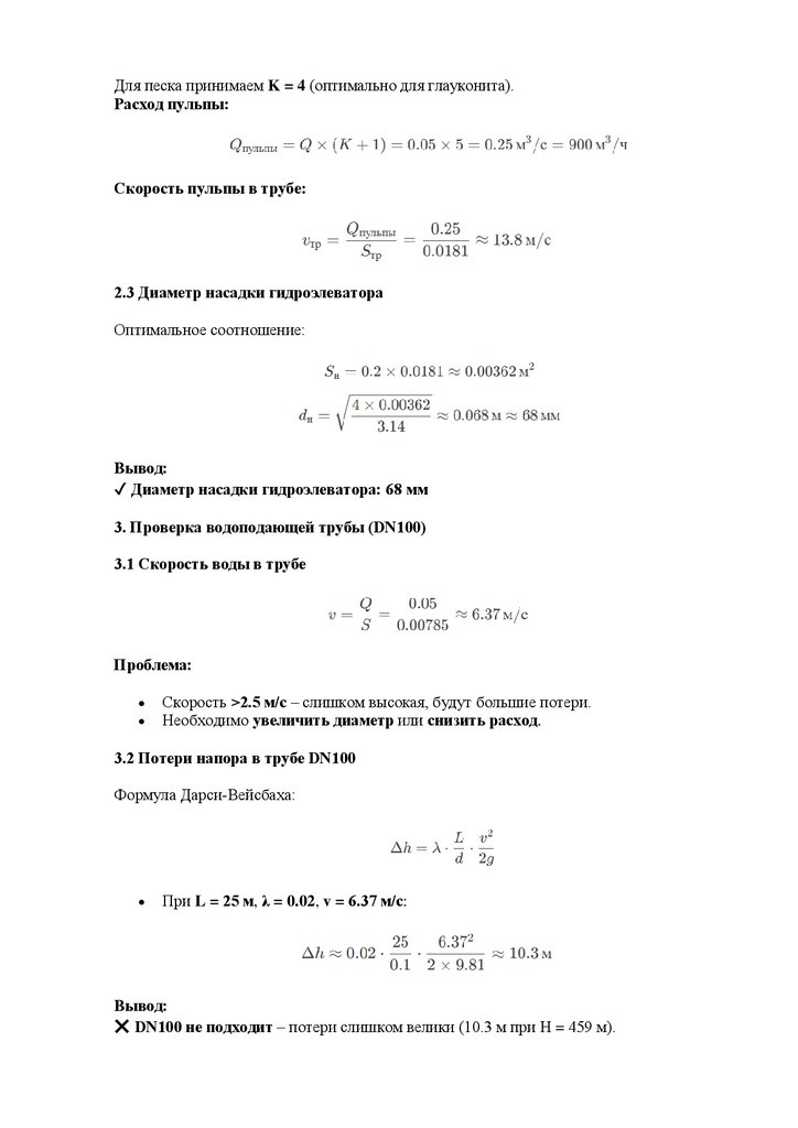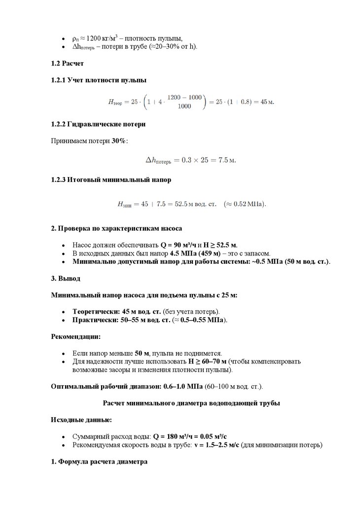 Скорость пульпы: v = 0.125/0.0181 ≈ 6.9 м/с (допустимо)