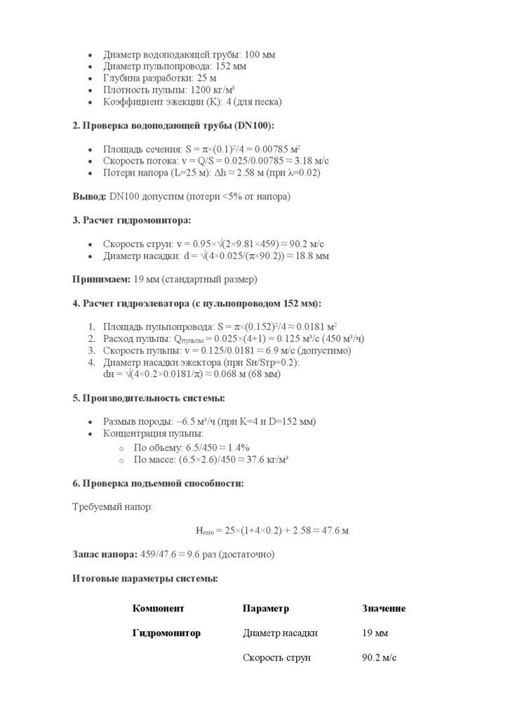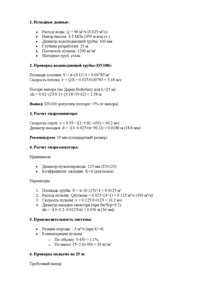 Расчет показывает оптимальный диаметр пульпоподъемной трубы 125 мм. В нашей