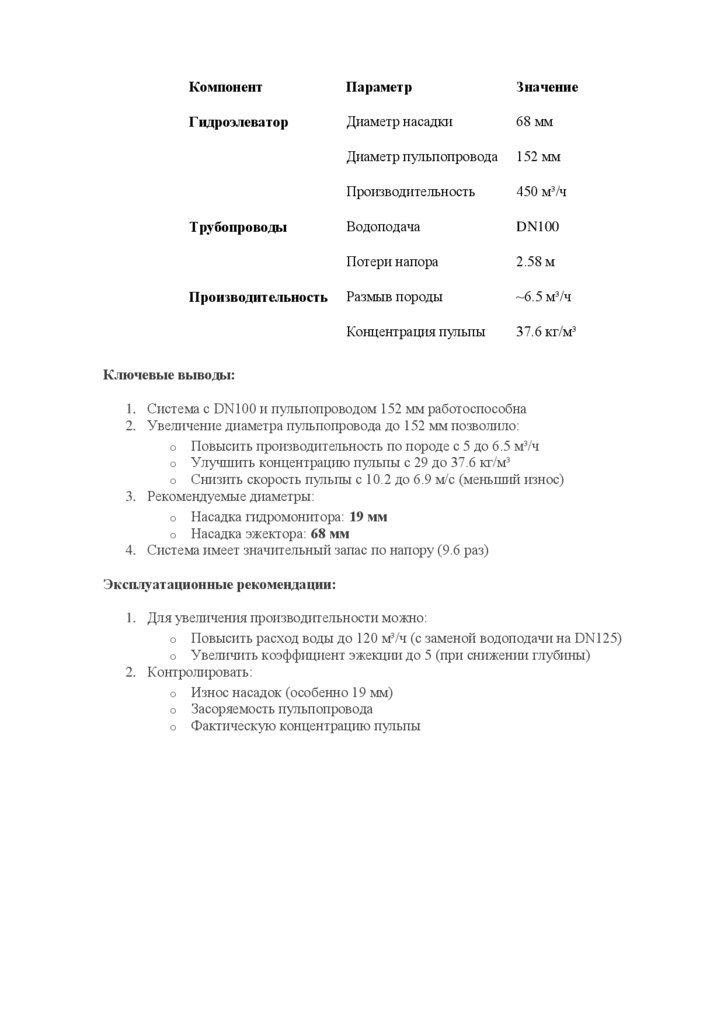 перерасчет работоспособности системы на диаметр пульпоподъемной трубы 152 мм.