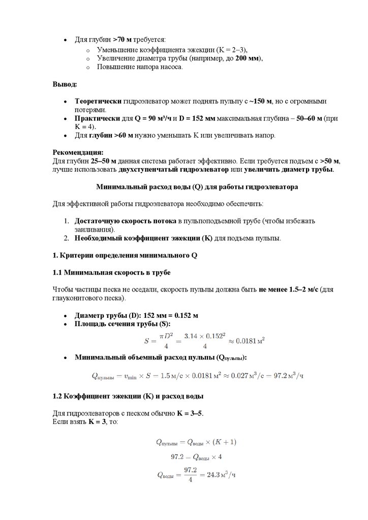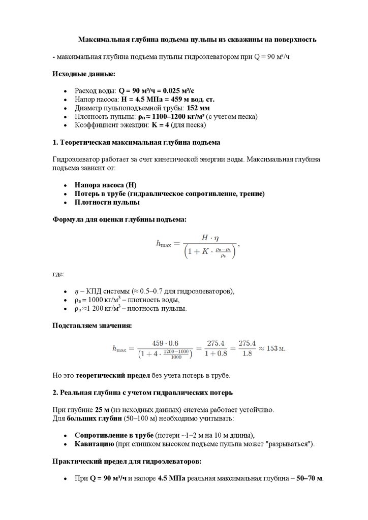 Диаметр пульпоподъемной трубы: D = 152 мм = 0.152 мГлубина подъема: h = 25 м