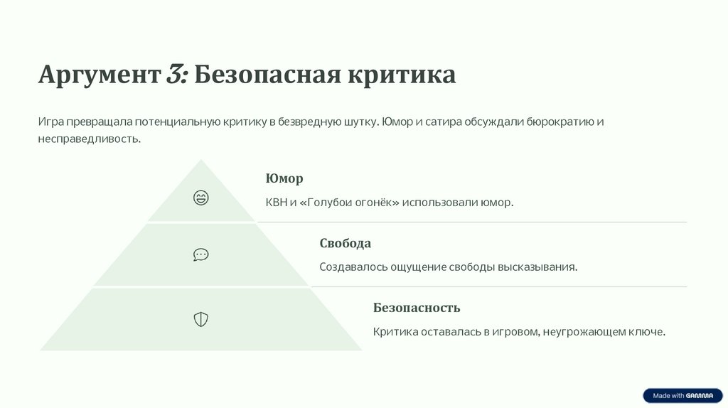 Аргумент 3: Безопасная критикаИгра превращала потенциальную критику в безвредную шутку. Юмор и сатира обсуждали бюрократию и