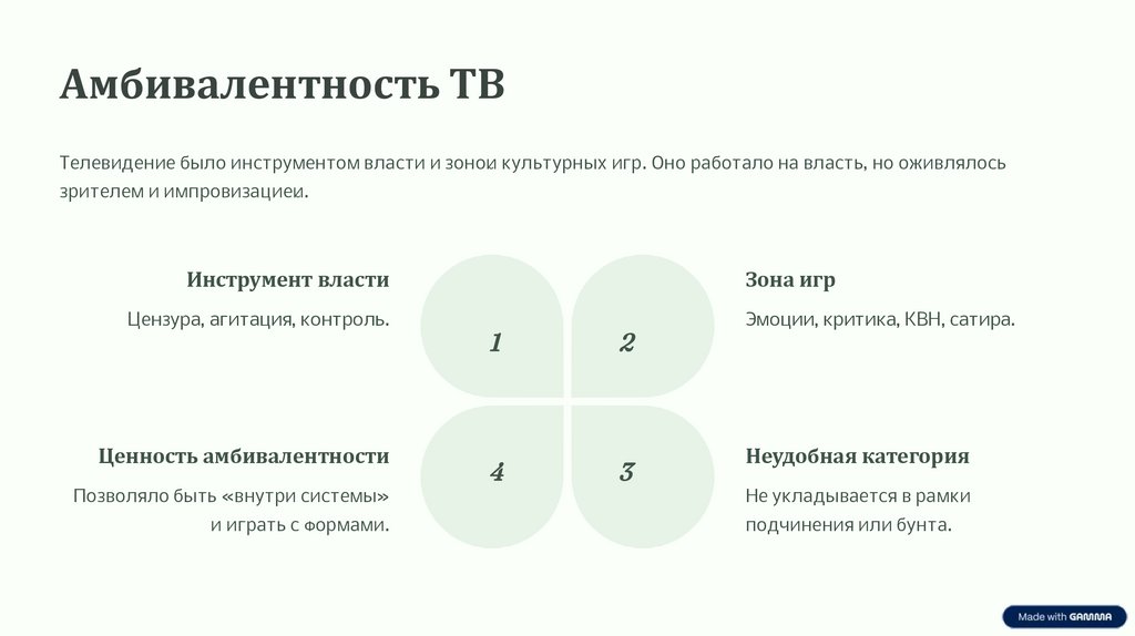 Амбивалентность ТВТелевидение было инструментом власти и зоной культурных игр. Оно работало на власть, но оживлялось