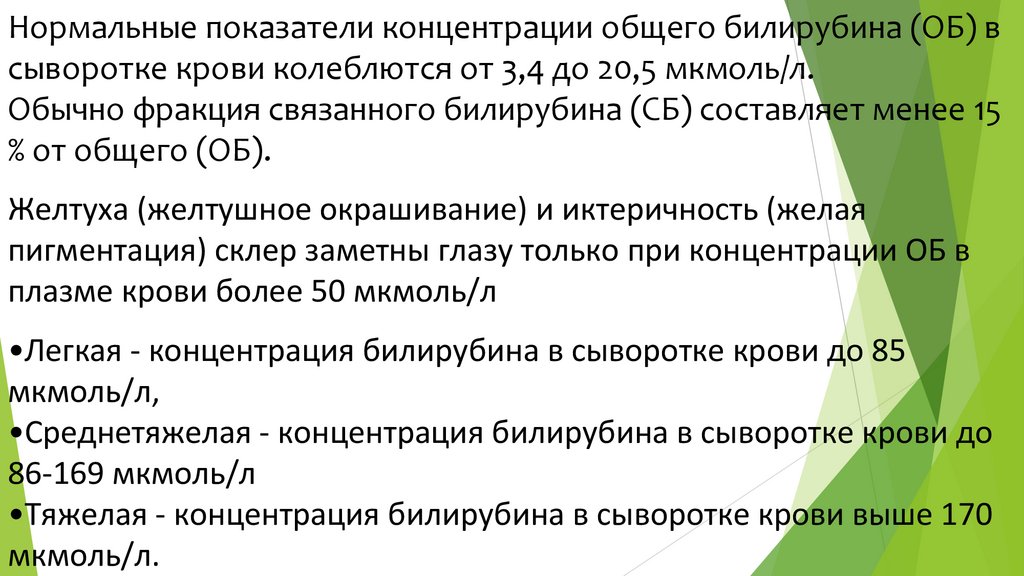 Нормальные показатели концентрации общего билирубина (ОБ) всыворотке крови колеблются от 3,4 до 20,5 мкмоль/л.