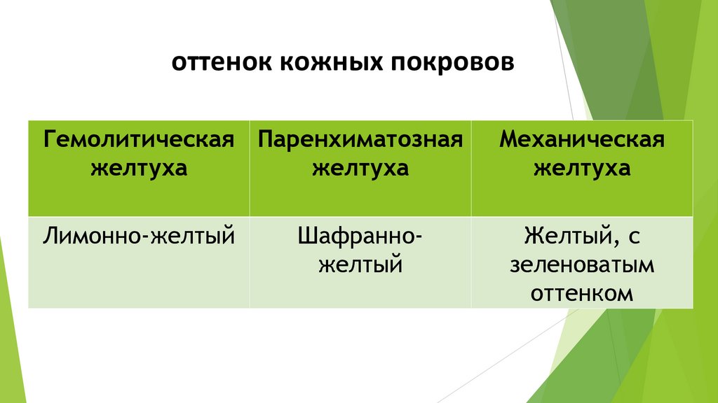 оттенок кожных покрововГемолитическая Паренхиматозная