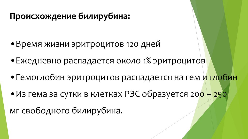 Происхождение билирубина:•Время жизни эритроцитов 120 дней