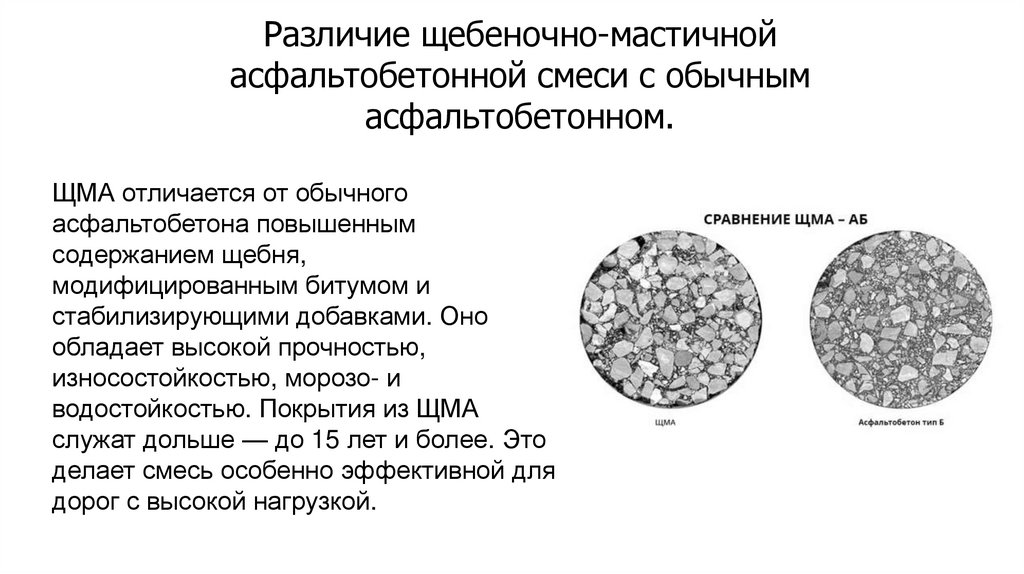 Различие щебеночно-мастичнойасфальтобетонной смеси с обычным