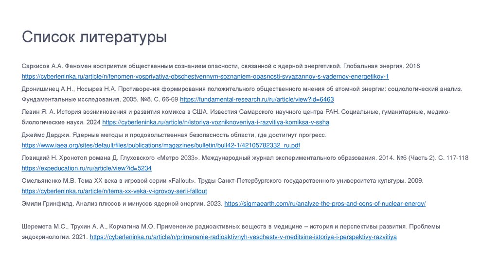 Список литературыСаркисов А.А. Феномен восприятия общественным сознанием опасности, связанной с ядерной энергетикой. Глобальная энергия. 2018