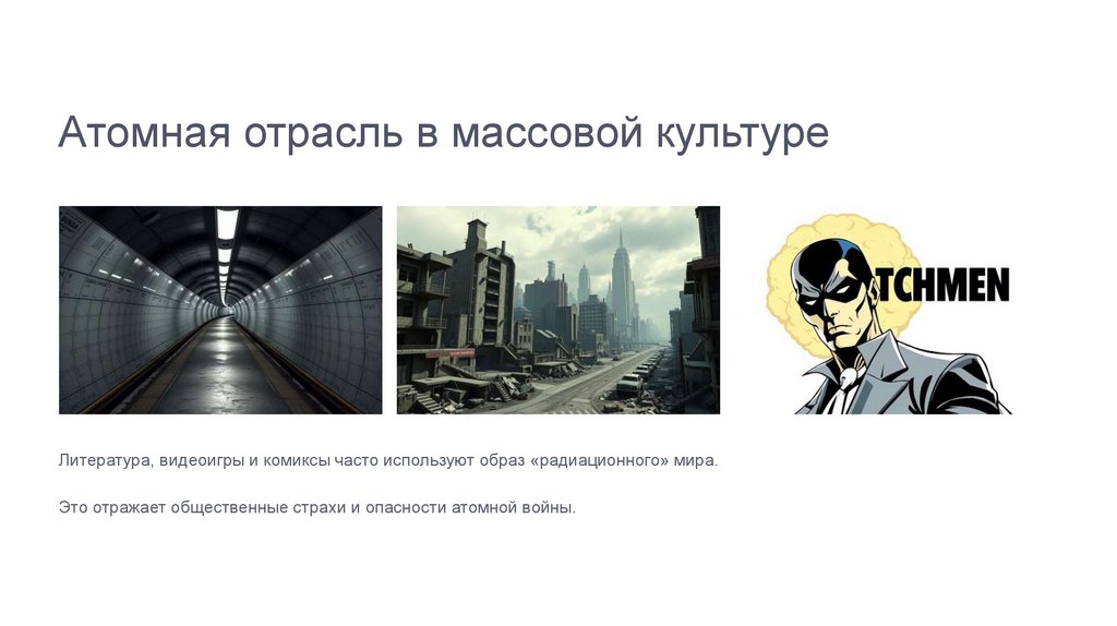 Атомная отрасль в массовой культуреЛитература, видеоигры и комиксы часто используют образ «радиационного» мира.