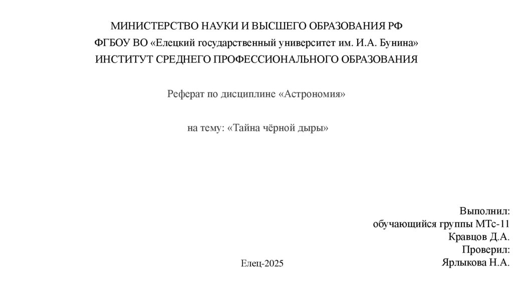 МИНИСТЕРСТВО НАУКИ И ВЫСШЕГО ОБРАЗОВАНИЯ РФФГБОУ ВО «Елецкий государственный университет им. И.А. Бунина»