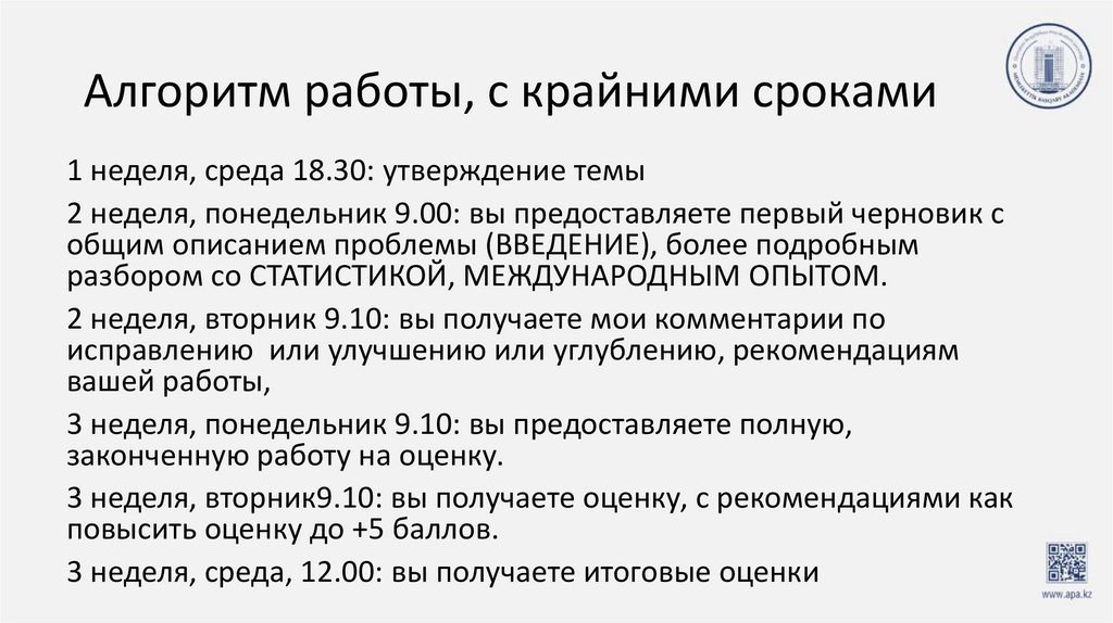 Алгоритм работы, с крайними сроками1 неделя, среда 18.30: утверждение темы