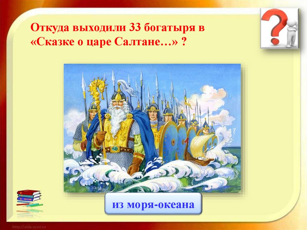 Откуда выходили 33 богатыря в«Сказке о царе Салтане…» ?