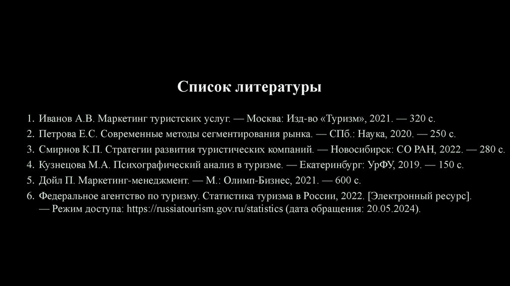 Список литературы1. Иванов А.В. Маркетинг туристских услуг. — Москва: Изд-во «Туризм», 2021. — 320 с.