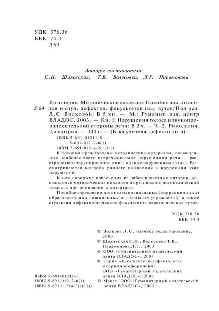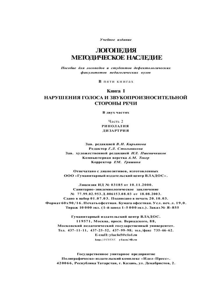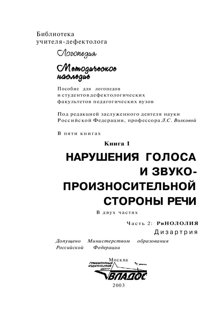 ВЛАДОС, 2003. — Кн. I: Нарушения голоса и звукопроизносительной стороны речи: В 2 ч. — Ч. 2. Ринолалия.