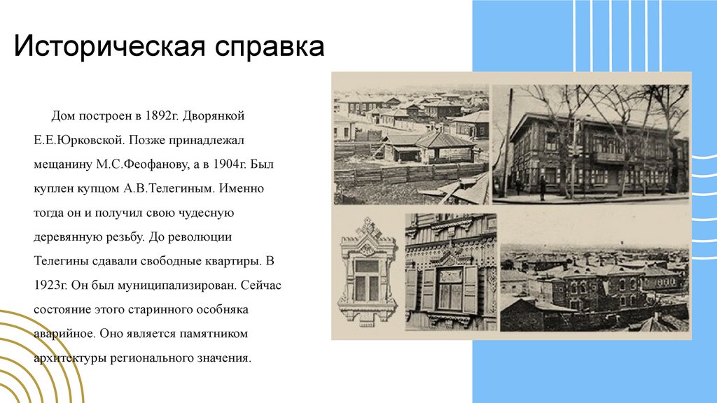 Историческая справкаДом построен в 1892г. Дворянкой