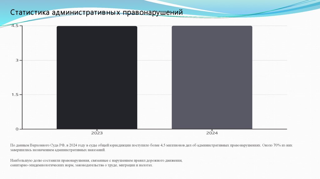 Статистика административ ны х правонарушенийПо данным Верховного Суда РФ, в 2024 году в суды общей юрисдикции поступило более 4,5 миллионов дел об административных правонарушениях. Около 70% из них