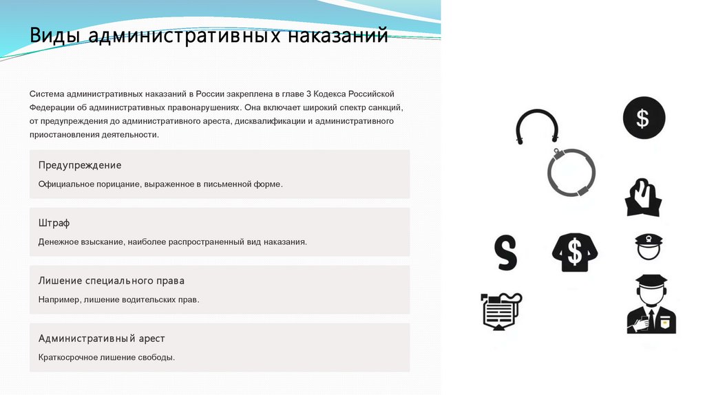 Виды административ ны х наказанийСистема административных наказаний в России закреплена в главе 3 Кодекса Российской