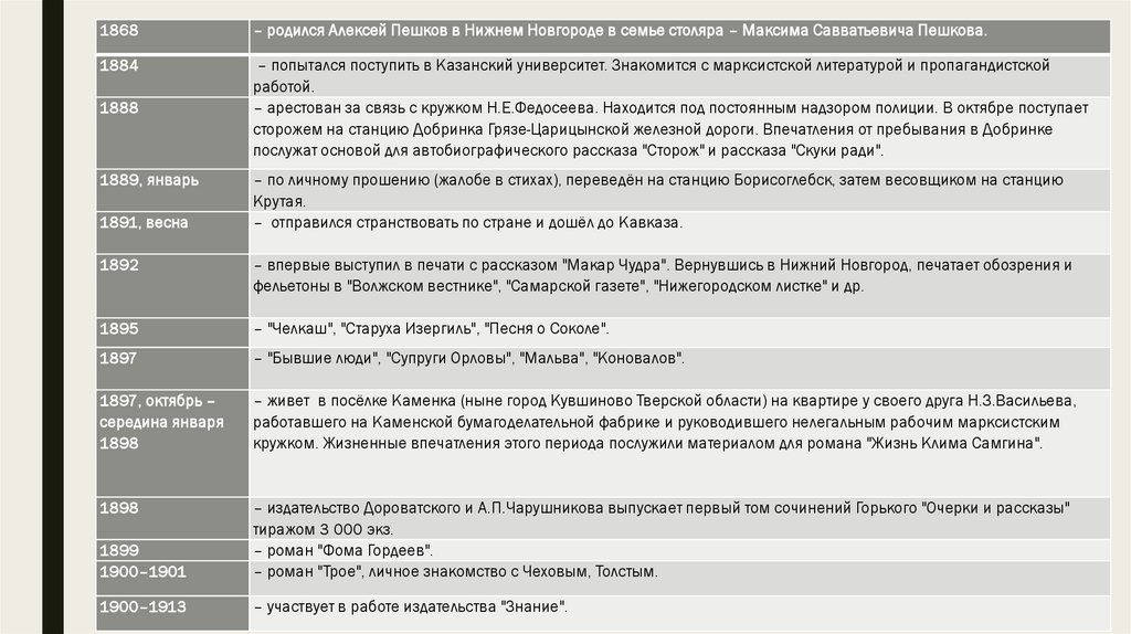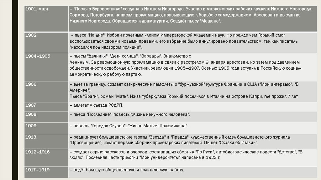 1901, март– "Песня о Буревестнике" создана в Нижнем Новгороде. Участие в марксистских рабочих кружках Нижнего Новгорода,