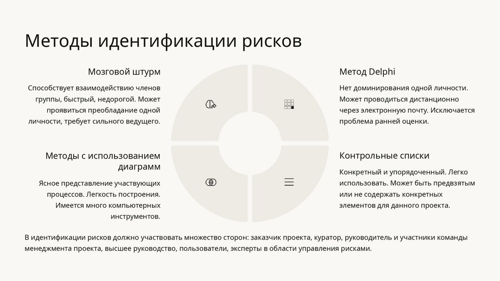 В идентификации рисков должно участвовать множество сторон: заказчик проекта, куратор, руководитель и участники команды