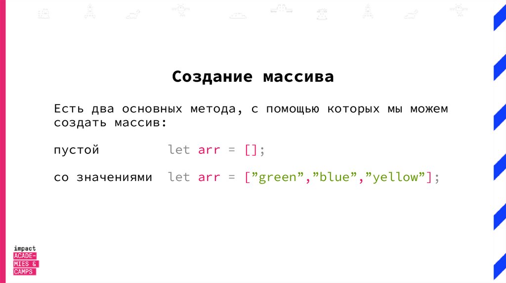Создание массиваЕсть два основных метода, с помощью которых мы можем