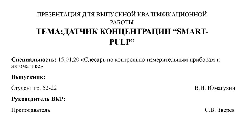 1. ПРЕЗЕНТАЦИЯ ДЛЯ ВЫПУСКНОЙ КВАЛИФИКАЦИОННОЙ РАБОТЫ ТЕМА:ДАТЧИК КОНЦЕНТРАЦИИ “SMART-PULP”
