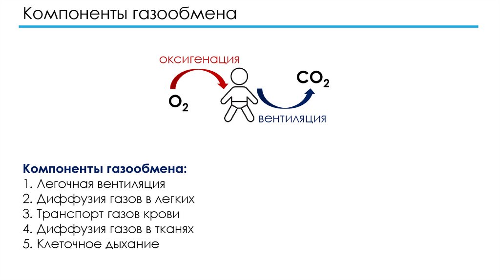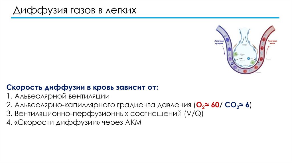 2. Альвеолярно-капиллярного градиента давления (О2≈ 60/ СО2≈ 6)