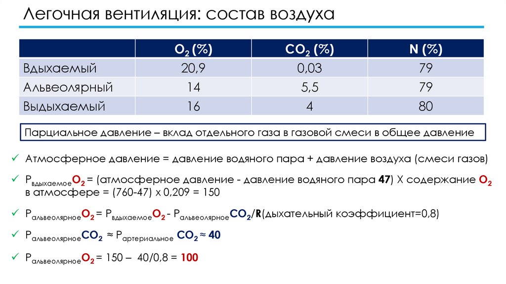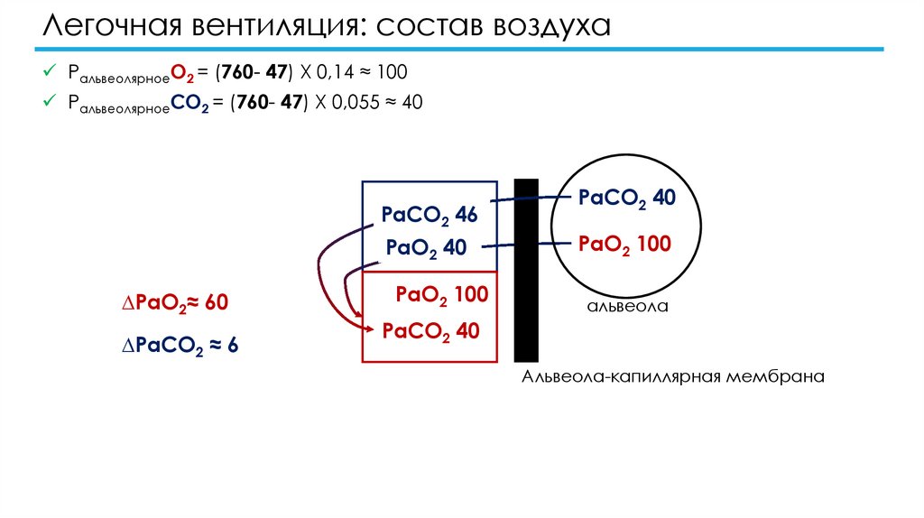 Легочная вентиляция: состав воздухаPальвеолярноеО2 = (760- 47) X 0,14 ≈ 100