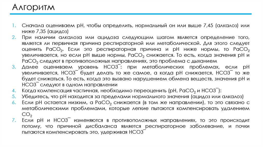 При наличии алкалоза или ацидоза следующим шагом является определение того,