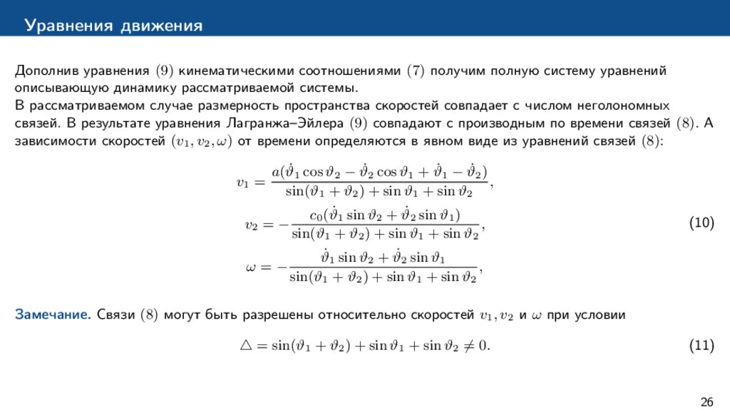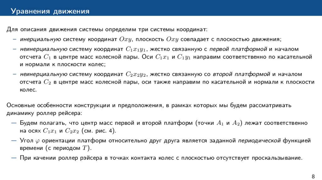 Некоторые известные результаты исследования динамики роллер рэйсера– В наиболее общем случае свободная динамика роллер рэйсера исследуется в [8]. Получены уравнения