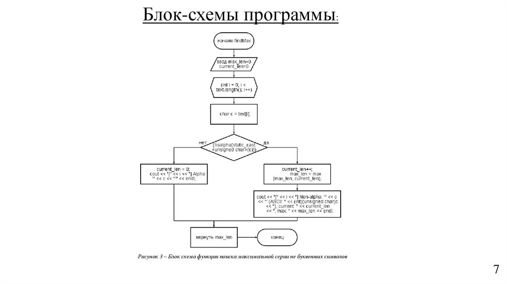 Блок-схемы программы:Рисунок 3 – Блок схема функции поиска максимальной серии не буквенных символов