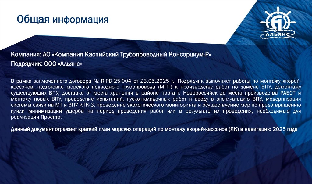 Компания: АО «Компания Каспийский Трубопроводный Консорциум-Р»Подрядчик: ООО «Альянс»