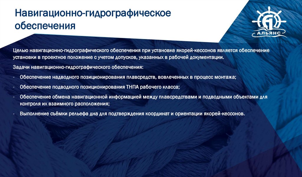 Целью навигационно-гидрографического обеспечения при установке якорей-кессонов является обеспечениеустановки в проектное положение с учетом допусков, указанных в рабочей документации.