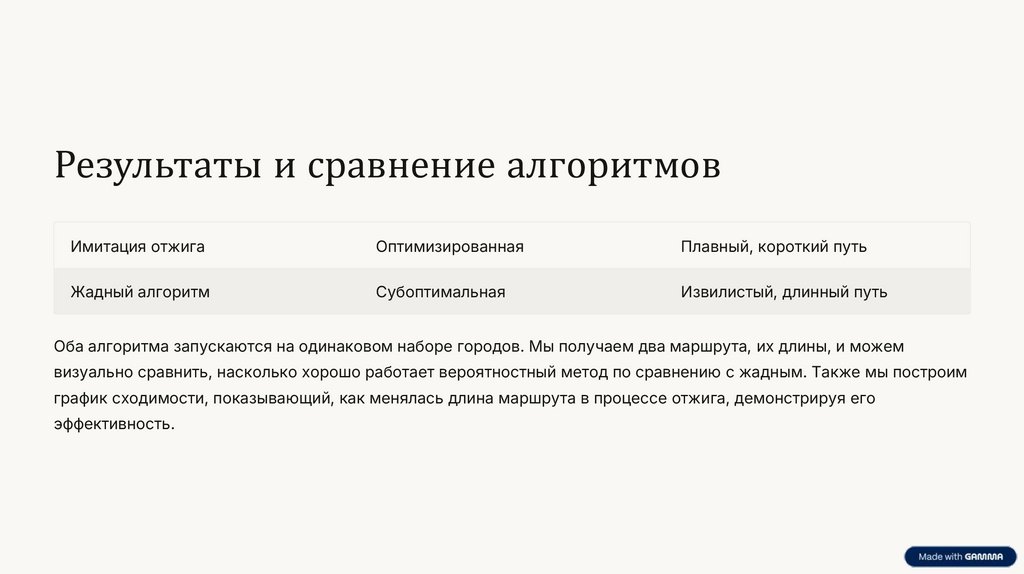 Оба алгоритма запускаются на одинаковом наборе городов. Мы получаем два маршрута, их длины, и можем