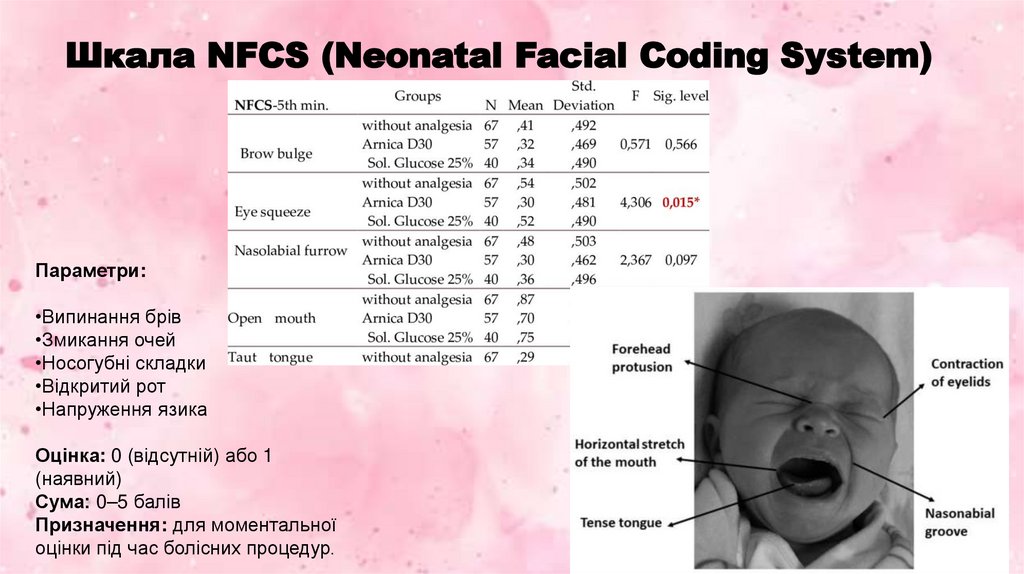 Шкала NFCS (Neonatal Facial Coding System)Параметри: