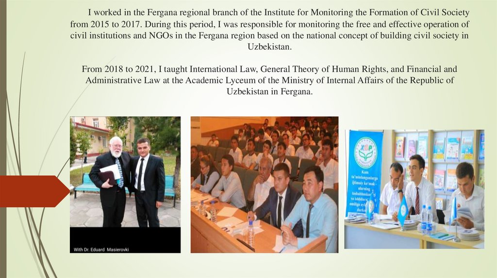 During this period, I was responsible for monitoring the free and effective operation ofcivil institutions and NGOs in the Fergana region based on the national concept of building civil society in