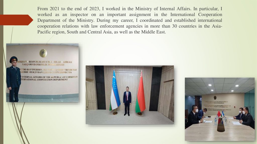 From 2021 to the end of 2023, I worked in the Ministry of Internal Affairs. In particular, Iworked as an inspector on an important assignment in the International Cooperation